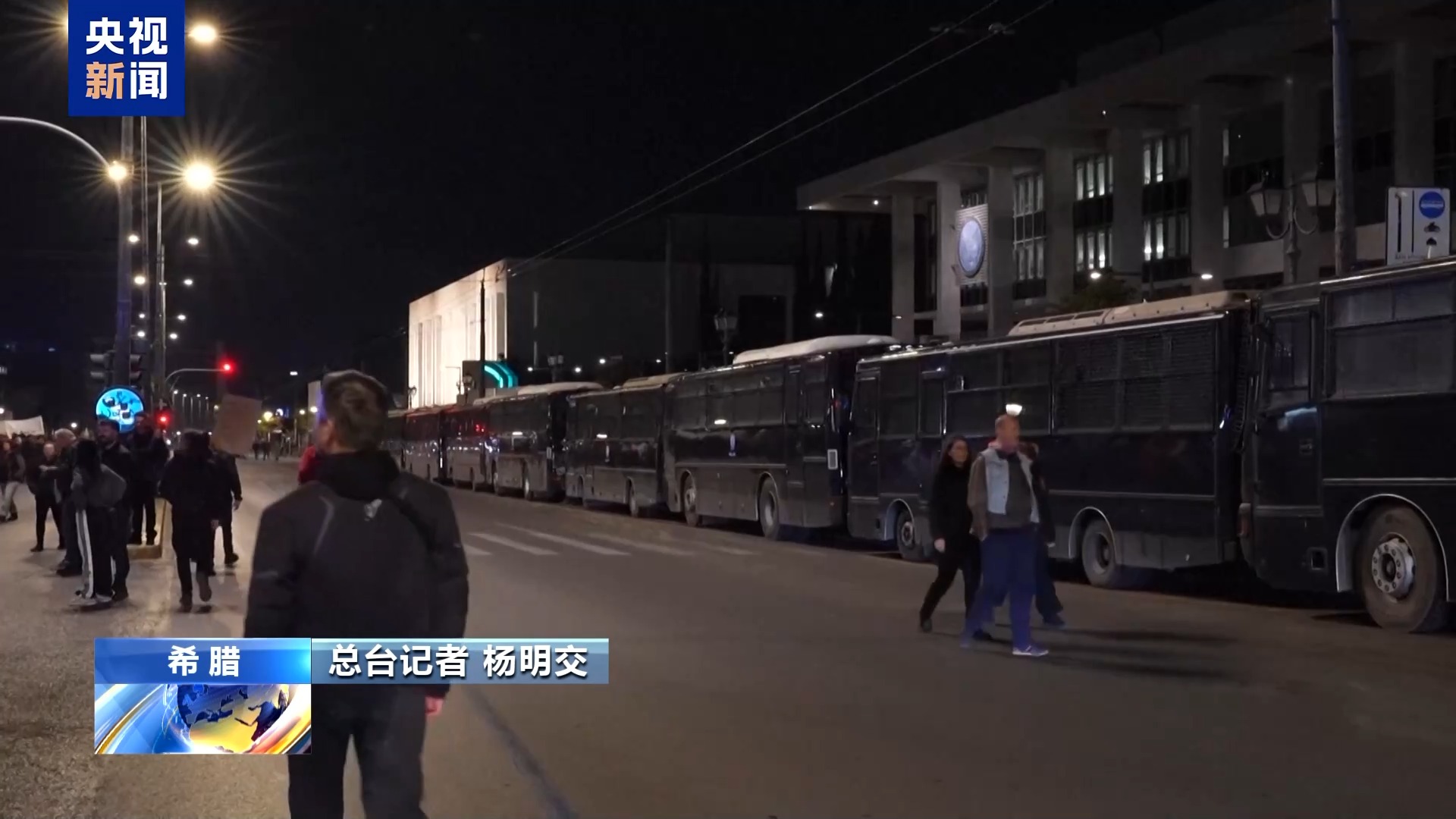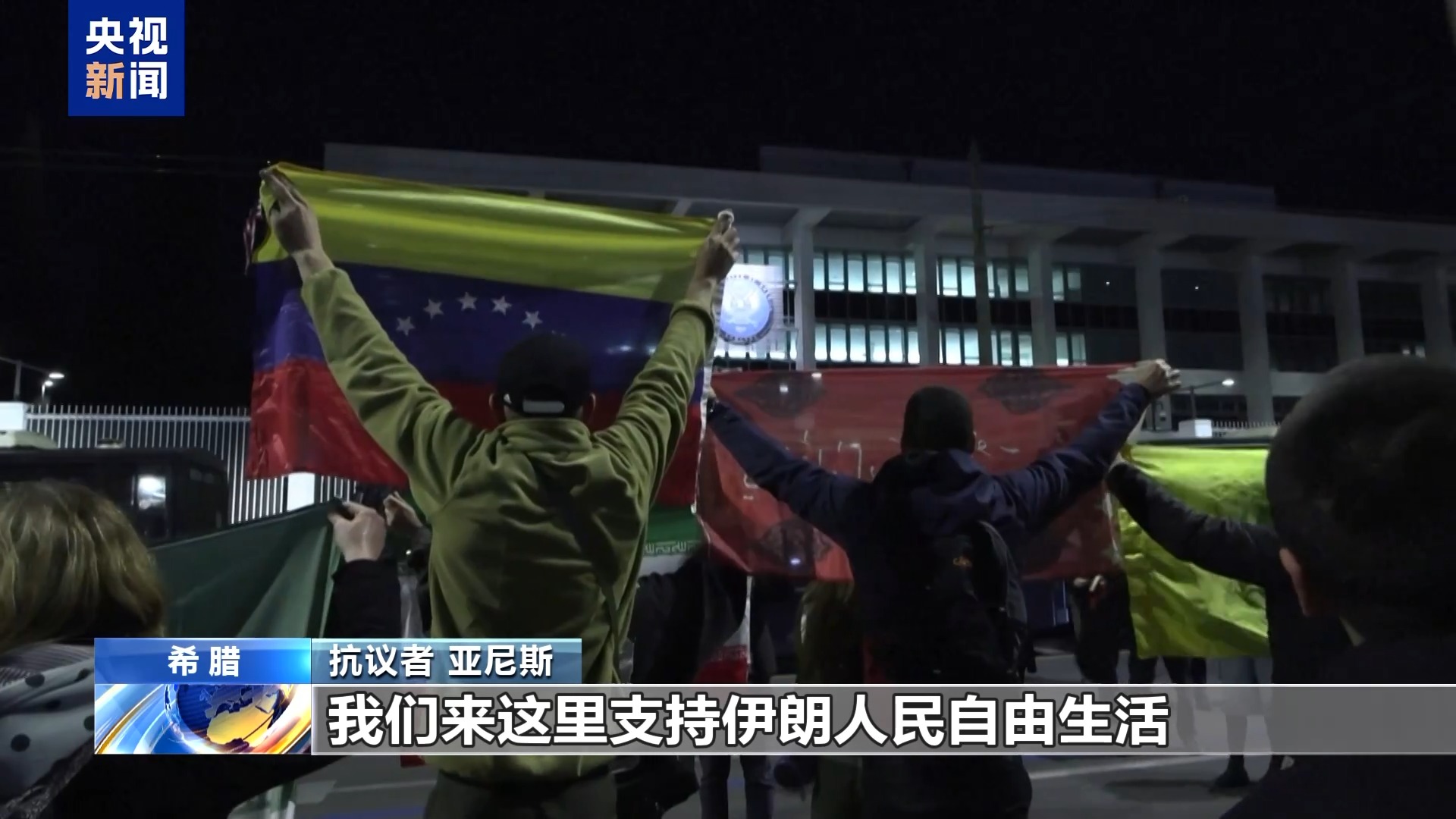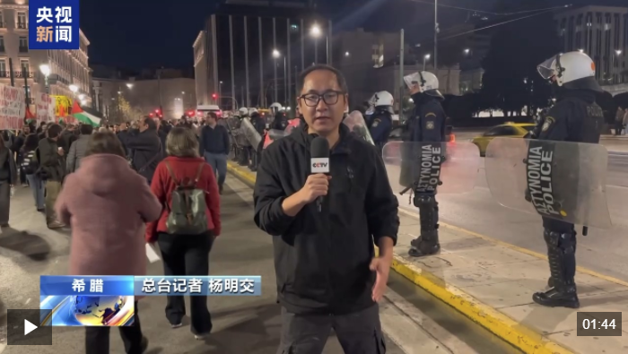总台记者杨明交:我现在是在雅典市中心宪法广场,12日晚上,大批希腊民众聚集在这里,抗议美国和以色列对伊朗采取的军事行动。