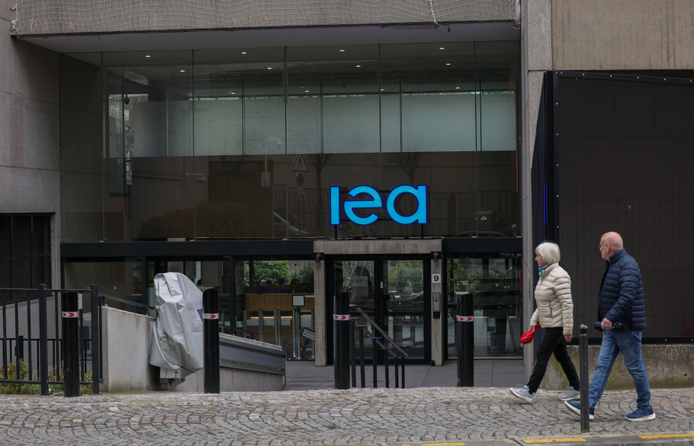 3月13日,在法国巴黎,行人经过国际能源署总部入口。新华社记者 邬惠我 摄