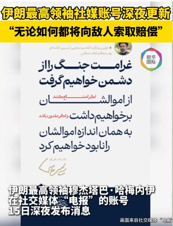 伊朗最高领袖穆杰塔巴·哈梅内伊在社交媒体“电报”的账号15日深夜发布消息,重申伊朗无论如何都“将向敌人索取赔偿”。如果敌人拒绝赔偿,伊朗将没收其相应价值的资产;如果无法没收,伊朗将摧毁其同等价值的资产。(记者:胡若愚;视频:王玉珏)