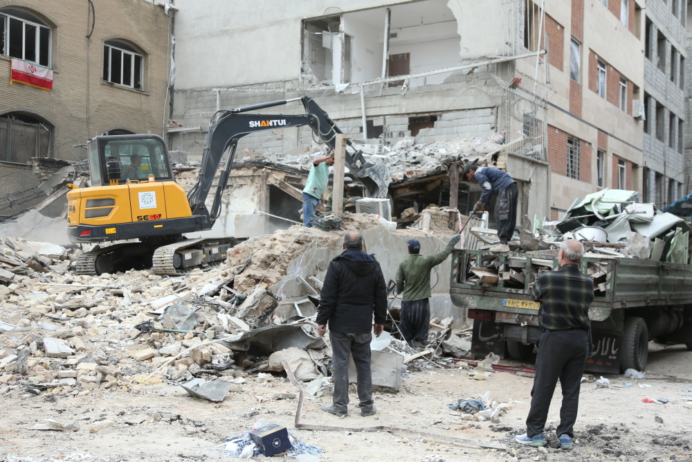 3月15日,在伊朗首都德黑兰的一处遇袭居民区,人们清理建筑废墟。新华社记者 沙达提 摄