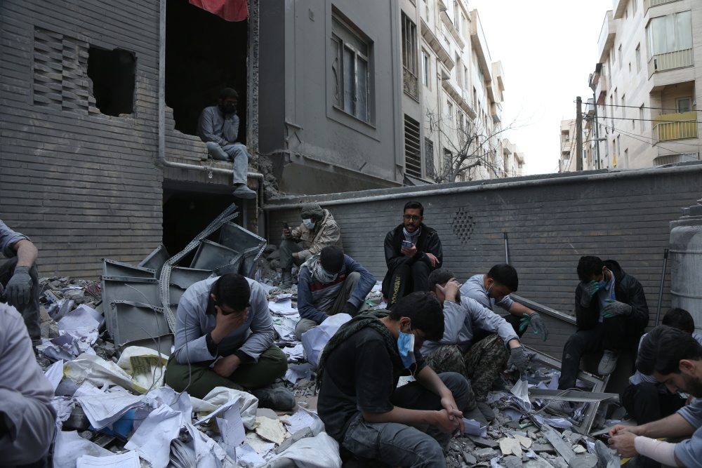 3月15日,在伊朗首都德黑兰的一处遇袭居民区,人们坐在一处建筑废墟上。新华社记者 沙达提 摄