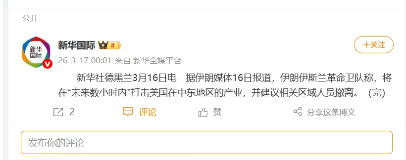 据伊朗媒体16日报道,伊朗伊斯兰革命卫队称,将在“未来数小时内”打击美国在中东地区的产业,并建议相关区域人员撤离。