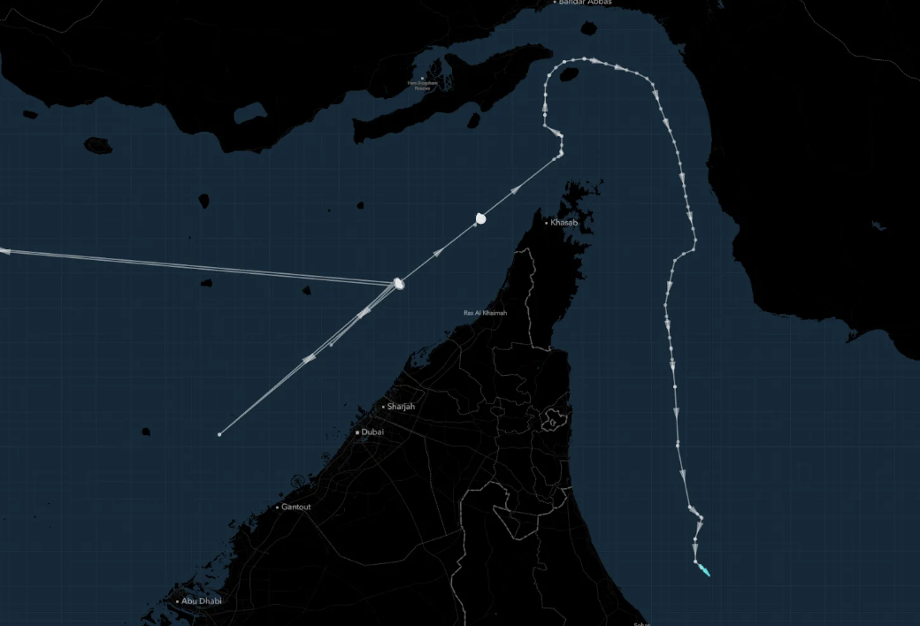 航运跟踪数据显示,这艘搭载着阿联酋原油的油轮始发地为阿联酋达斯岛(Das Island),在穿越霍尔木兹海峡后,绕行至伊朗拉拉克岛附近,贴着伊朗海岸线航行,并于周日晚间驶离了海峡。