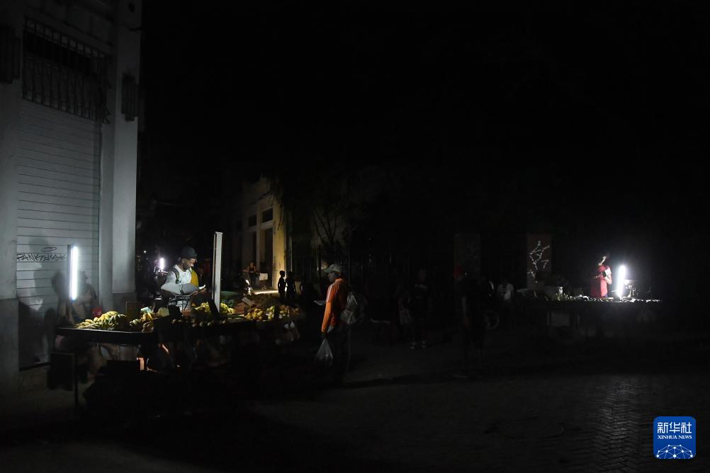 3月16日晚,在古巴首都哈瓦那停电期间,商贩在街头出售商品。新华社发(华金·埃尔南德斯摄)