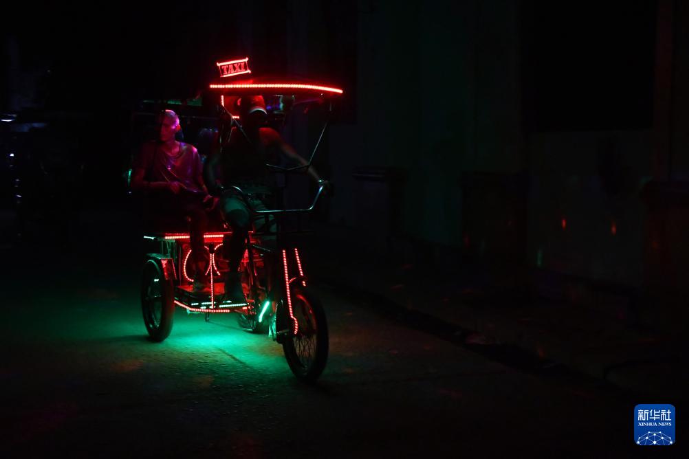 3月16日晚,在古巴首都哈瓦那停电期间,人们乘坐人力三轮车出行。新华社发(华金·埃尔南德斯摄)