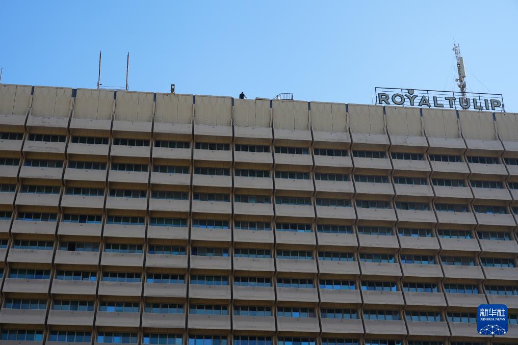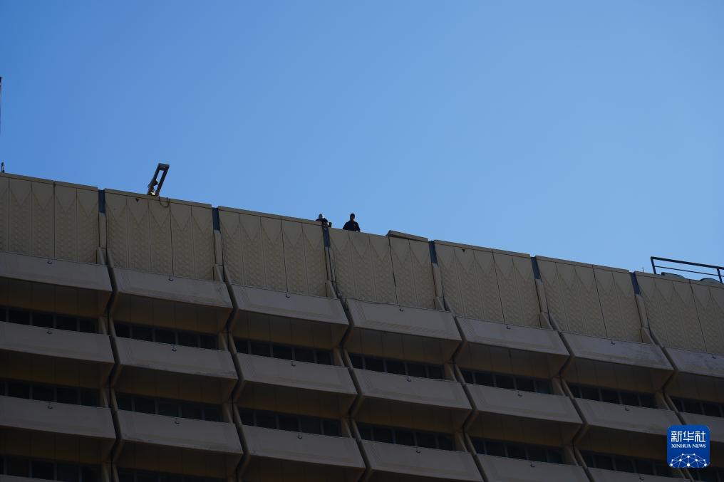 3月17日,在伊拉克首都巴格达,拉希德酒店工作人员对在空袭中受损的建筑顶部进行检修。新华社记者 段敏夫 摄
