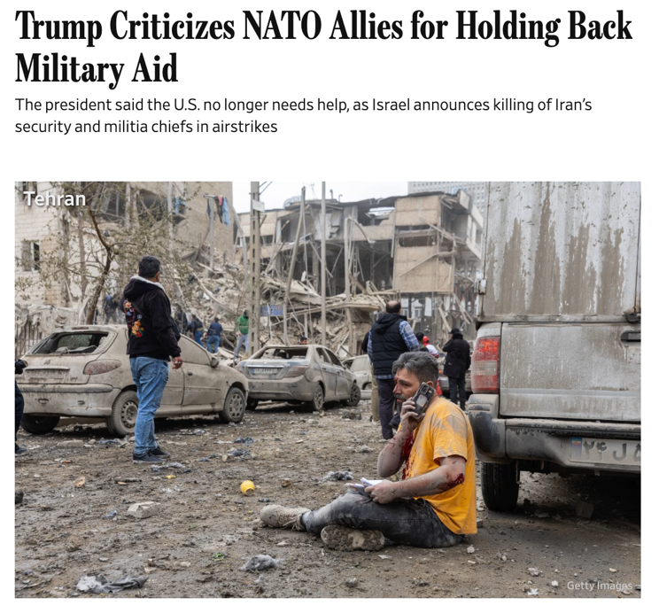 △《华尔街日报》报道,特朗普猛烈抨击北约盟国不愿支持美国在伊朗的行动。