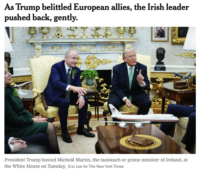 △《纽约时报》报道,对于特朗普批评欧洲盟友的言论,3月17日到访白宫的爱尔兰总理米歇尔·马丁进行了反驳。