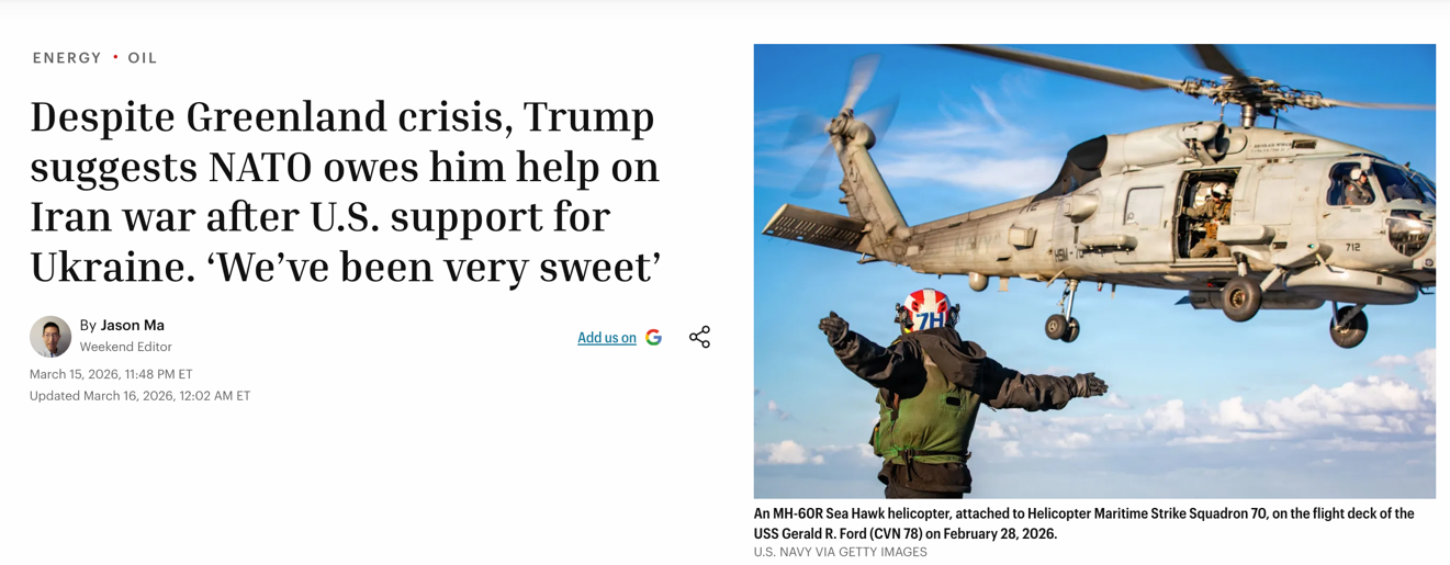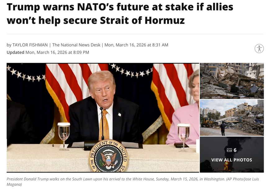 当地时间3月17日,美国总统特朗普在讲话中多次表达对北约盟友支持不足的不满,警告称,如果北约成员不协助美国“重新打通霍尔木兹海峡”,该联盟将面临“非常糟糕的未来”。他甚至直言,退出北约“值得考虑”。几乎与此同时,欧洲多国明确拒绝参与相关军事行动,强调这不是一场“北约的战争”。