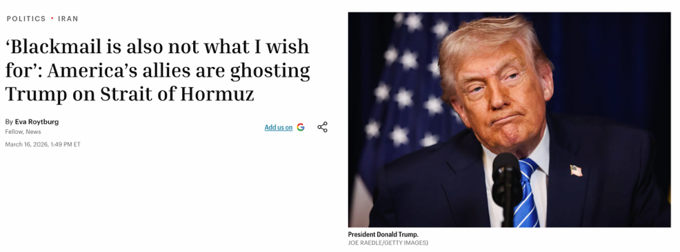 △《财富》杂志报道,美国盟友在霍尔木兹海峡危机问题上,对特朗普冷眼旁观。