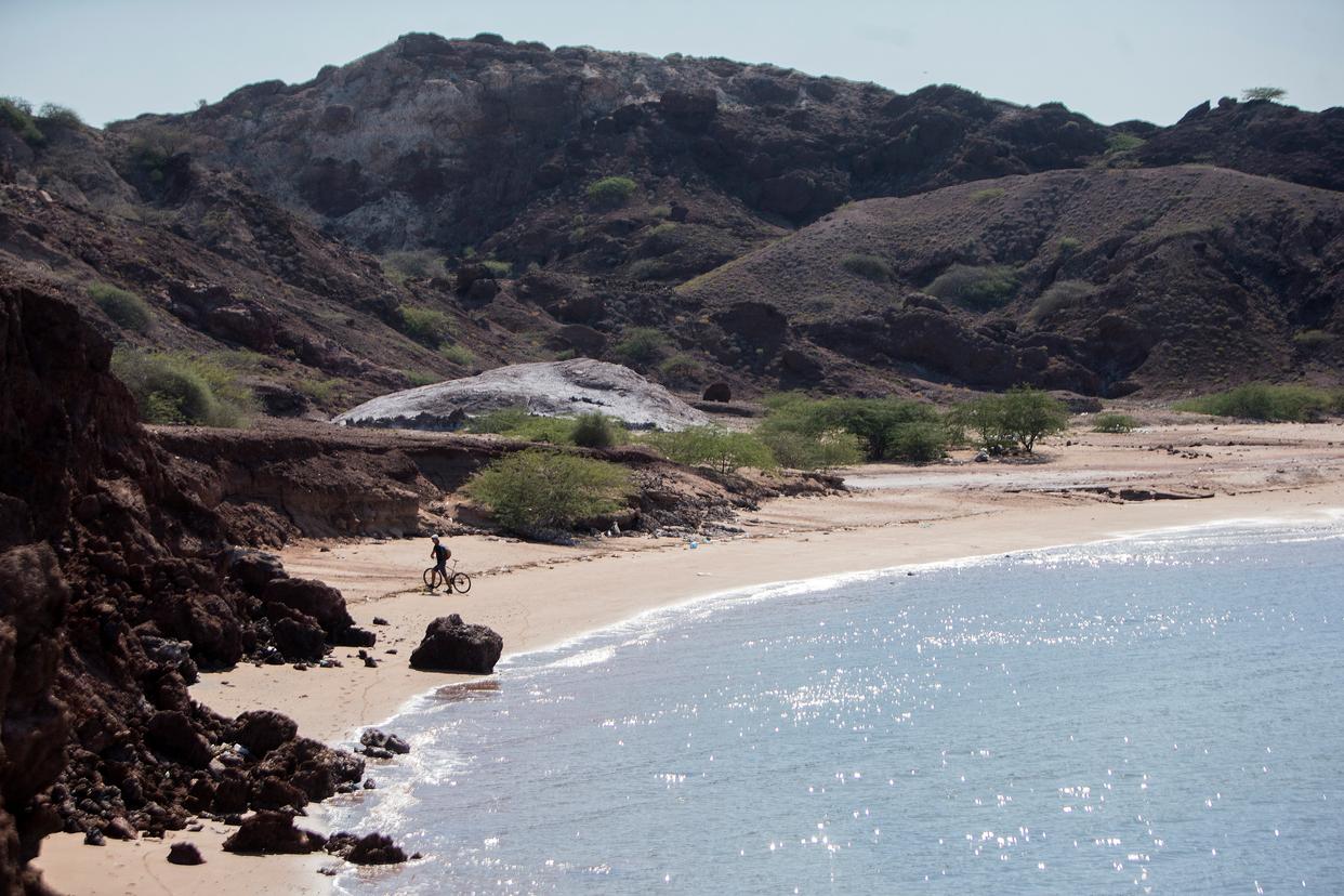 2019年11月27日,在伊朗南部霍尔木兹岛,一名男子推着自行车从海边走过。新华社发(艾哈迈德·哈拉比萨斯摄)