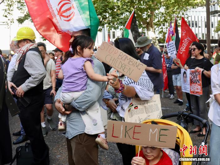 当地时间2026年3月14日,多个反战团体在澳大利亚悉尼市政厅外举行集会,抗议美国和以色列对伊朗发动军事打击。图中集会参与者手举的标语牌写着“停止轰炸像我一样的孩子”。 中新社记者薄雯雯摄