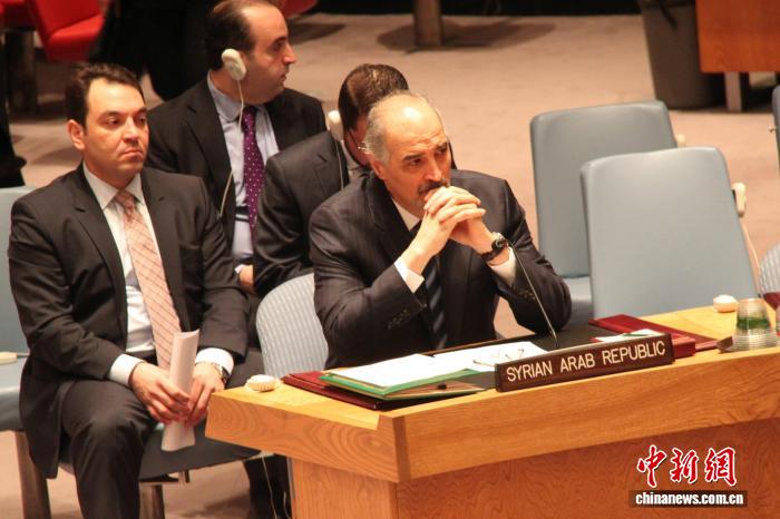 时任叙利亚常驻联合国代表贾法里(右前)出席联合国安理会会议。(资料图) 中新社记者 李洋摄