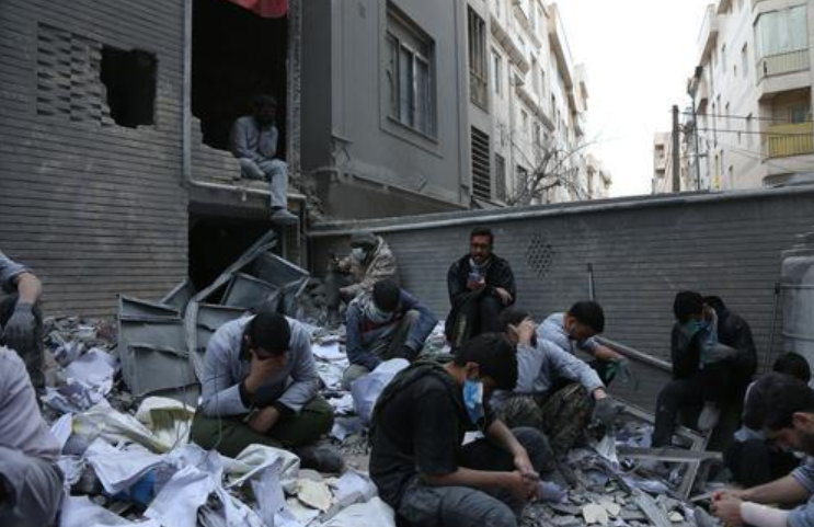 图为3月15日,在伊朗首都德黑兰的一处遇袭居民区,人们坐在一处建筑废墟上。