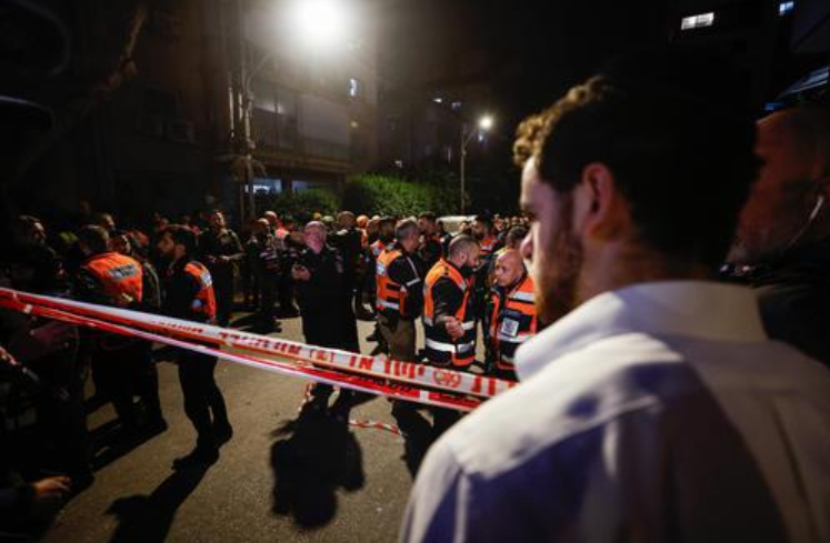 图为以色列中部城市拉马特干,应急反应人员在一处导弹袭击波及地点开展工作。