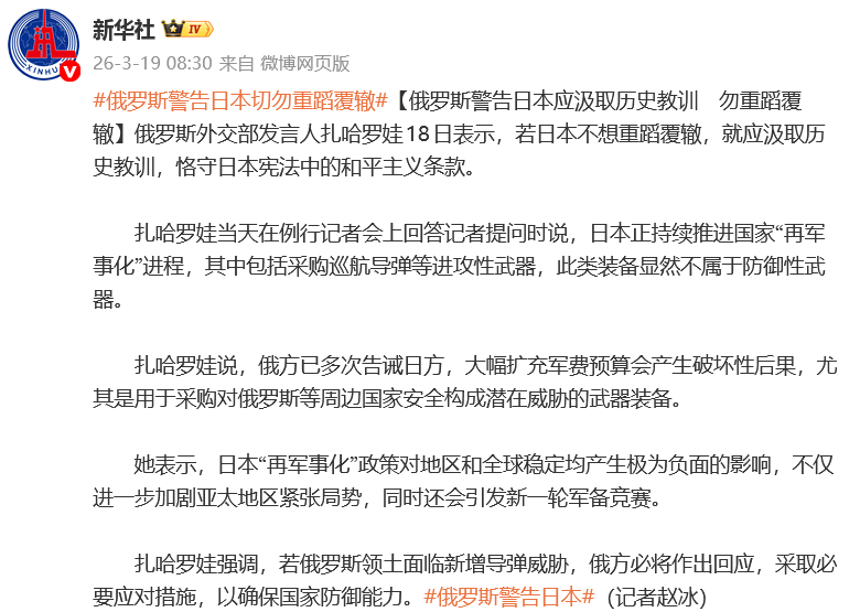 3月19日,@新华社:俄罗斯外交部发言人扎哈罗娃18日表示,若日本不想重蹈覆辙,就应汲取历史教训,恪守日本宪法中的和平主义条款。
