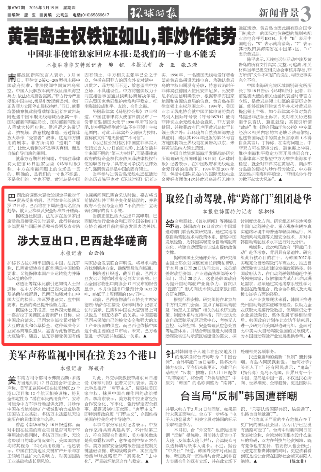 路透社等媒体此前引述知情人士报道称,在中方多次检出巴西大豆含农药及杀菌剂残留后,巴西已加强对出口中国大豆的检验。法瓦罗也证实,应中国要求,巴西的确已提升检验力度。
