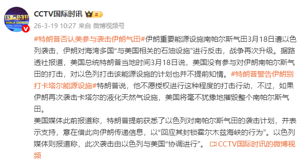 伊朗重要能源设施南帕尔斯气田3月18日遭以色列袭击,伊朗对海湾多国“与美国相关的石油设施”进行反击,战争再次升级。据路透社报道,美国总统特朗普当地时间3月18日说,美国没有参与对伊朗南帕尔斯气田的打击,对以色列打击该能源设施的计划也并不提前知情。卡塔尔也未以任何形式、任何方式卷入其中,更未预知此事将会发生。