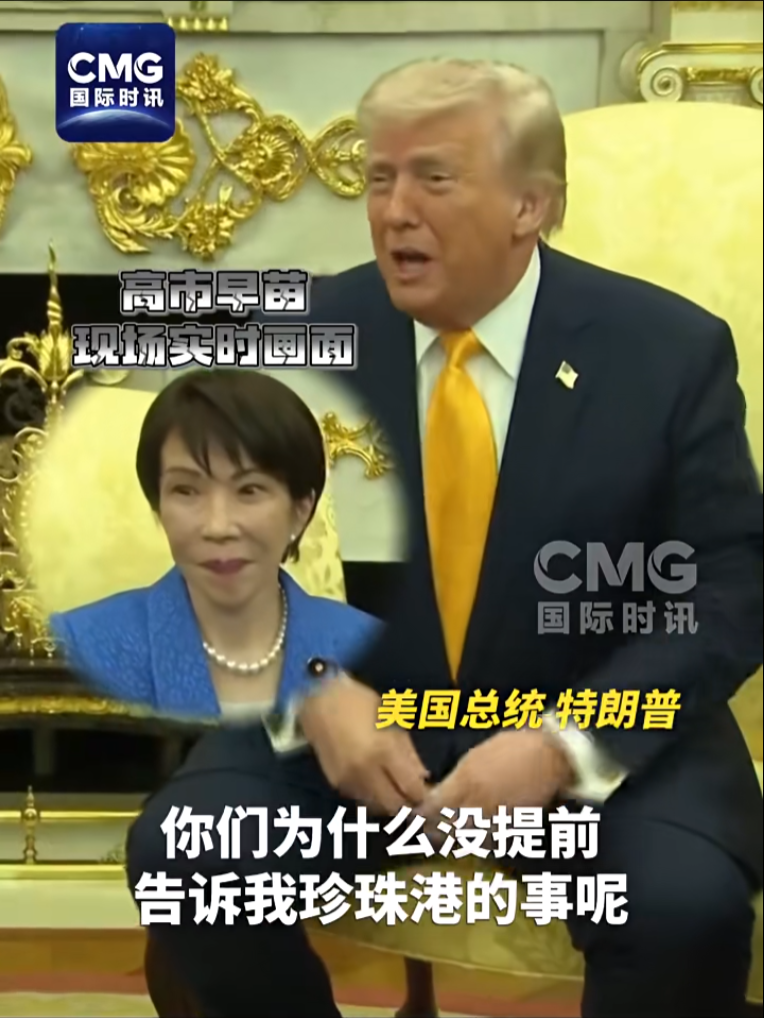 特朗普说这番话时,现场一片笑声。坐在一旁的高市早苗睁大了眼睛,在椅子上挪了挪身体,脸上努力保持着微笑。