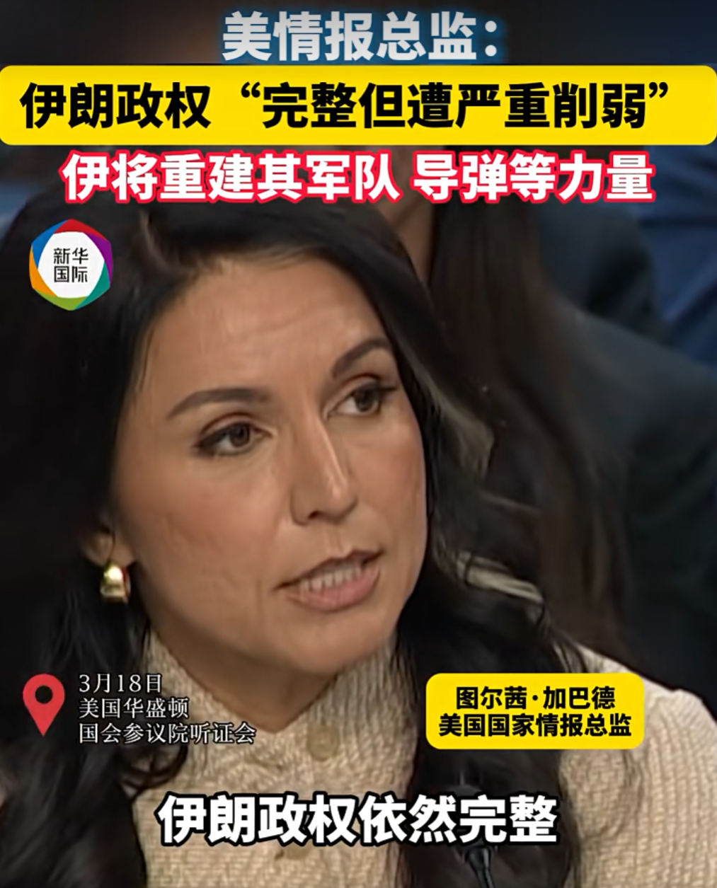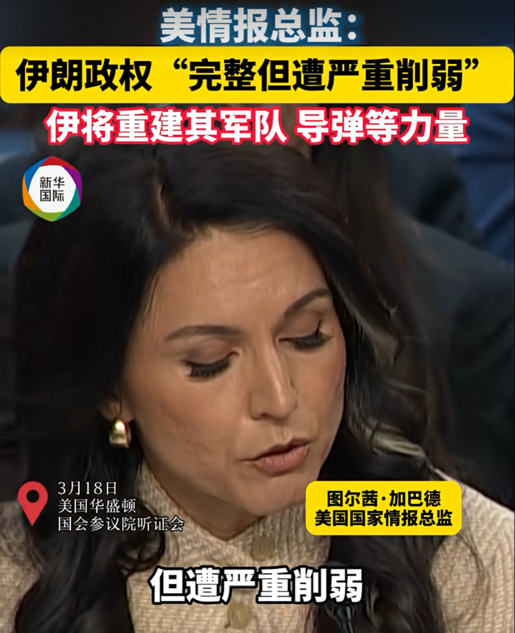 据新华社消息,在美国和以色列对伊朗发动军事行动约3周后,美国国家情报总监图尔茜·加巴德18日表示,伊朗政权“依然完整但遭严重削弱”。
