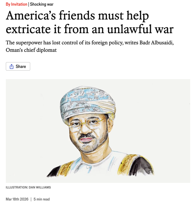 当地时间3月18日,阿曼外交大臣巴德尔在《经济学人》发表署名文章《美国的朋友们必须帮助美国从一场非法战争中脱身》,引发广泛关注。