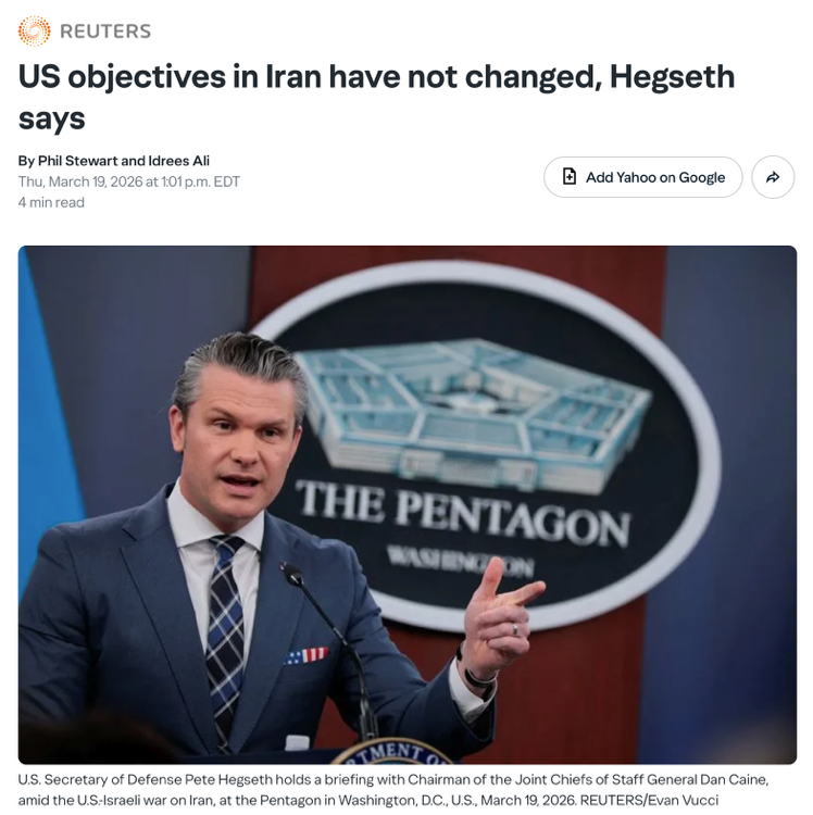 △路透社报道,国防部长赫格塞思表示,自2月28日开始对伊行动以来,美国对对伊战争目标没有改变