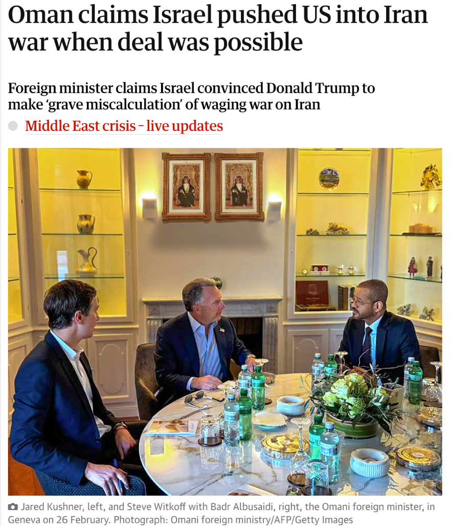 △《卫报》刊文报道,阿曼称以色列在双方仍有可能达成协议的情况下,将美国拖入了对伊战争