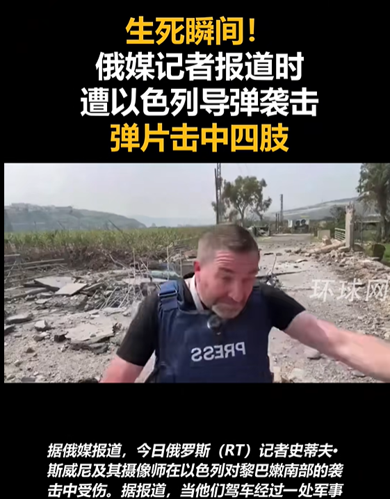 今日俄罗斯电视台说,该台驻黎巴嫩记者史蒂夫·斯威尼和他的摄影师在黎南部就以色列袭击黎方桥梁进行拍摄报道时,一架以色列战机朝他们发射一枚导弹。爆炸产生的弹片导致两人受伤入院。