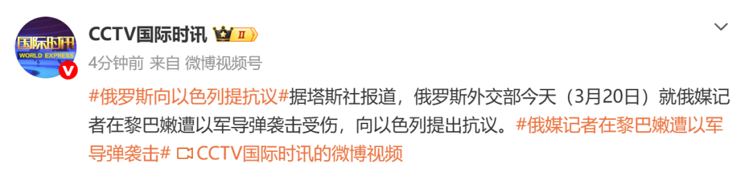 据塔斯社报道,俄罗斯外交部今天(3月20日)就俄媒记者在黎巴嫩遭以军导弹袭击受伤,向以色列提出抗议。