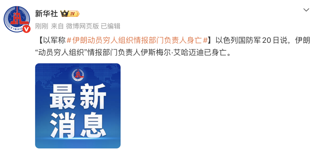 以军称伊朗“动员穷人组织”情报部门负责人已身亡
