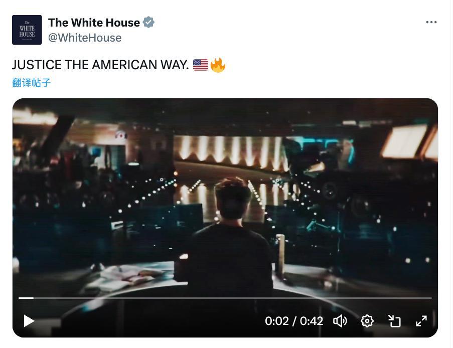 这是美国白宫社交媒体账号截图。账号发布的这段视频配文“美式正义”。 另一段配文为“美式正义”的白宫视频,更是将这种拼贴手法发挥到了极致。它混剪了《勇敢的心》《壮志凌云》《绝命毒师》等影视剧片段,结尾那句“完美胜利”直接取自格斗游戏。这种对流行文化的暴力征用引发强烈批评。好莱坞演员兼导演本·斯蒂勒要求白宫删除取自他电影里的剪辑片段,怒斥“战争不是电影”。参加过伊拉克战争的美国老兵康纳·克雷汉在社交平台上写道:“战争不是电子游戏。战争的后果是不可逆的。真希望我们不要如此轻率地对待它。”