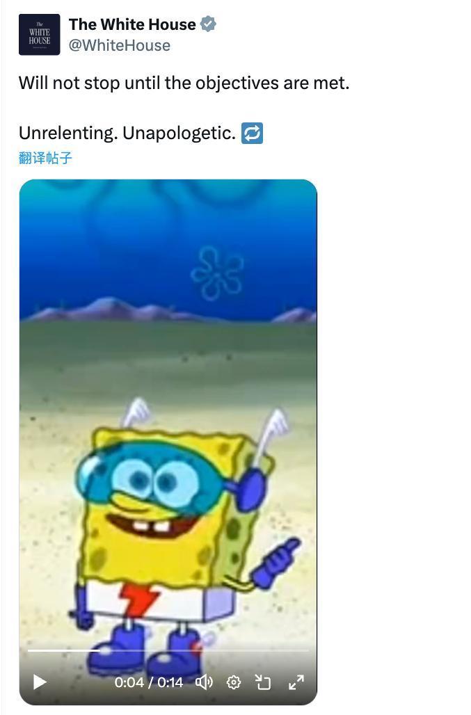 这是美国白宫社交媒体账号截图。该账号发布的这段视频中,海绵宝宝、电子游戏的欢快旋律与空袭伊朗的火光被剪辑在一起,视频配发文字“不达目的不罢休”。 近日,美国白宫在社交媒体上发布了一些引发巨大争议的视频:海绵宝宝、电子游戏的欢快旋律与空袭伊朗的火光被剪辑在一起,甚至配上“再看一遍?”的字幕。这出精心编排、试图通过媒介包装争取公众支持的“公关秀”不仅没能如愿收割好感,反而因其对人类苦难的公然漠视,遭到舆论的围剿。