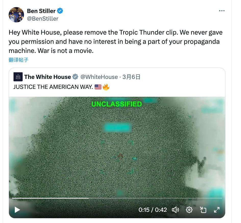 这是好莱坞演员兼导演本·斯蒂勒的社交媒体账号截图。他要求白宫删除取自他电影《热带惊雷》的剪辑片段,并表示“战争不是电影”。 过去,美国发动战争时,还会费尽心机编造一套冠冕堂皇的价值叙事。而今,连这层遮羞布也懒得披了,因为他们不再试图让你相信这场战争是正义的,而只想让你觉得它“很酷”。面对公众质疑,白宫发言人安娜·凯利轻描淡写地声称,这只是在“展示美军的非凡能力”。有美国媒体反唇相讥,白宫的确展示了一种能力,“一种将死亡转化为流量红利、将悲剧转化为娱乐消遣的能力”。