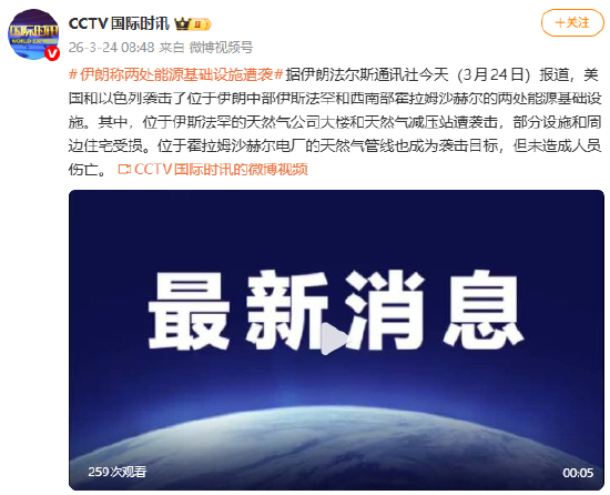 据伊朗法尔斯通讯社今天(3月24日)报道,美国和以色列袭击了位于伊朗中部伊斯法罕和西南部霍拉姆沙赫尔的两处能源基础设施。其中,位于伊斯法罕的天然气公司大楼和天然气减压站遭袭击,部分设施和周边住宅受损。位于霍拉姆沙赫尔电厂的天然气管线也成为袭击目标,但未造成人员伤亡。