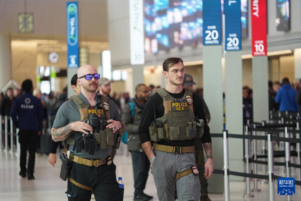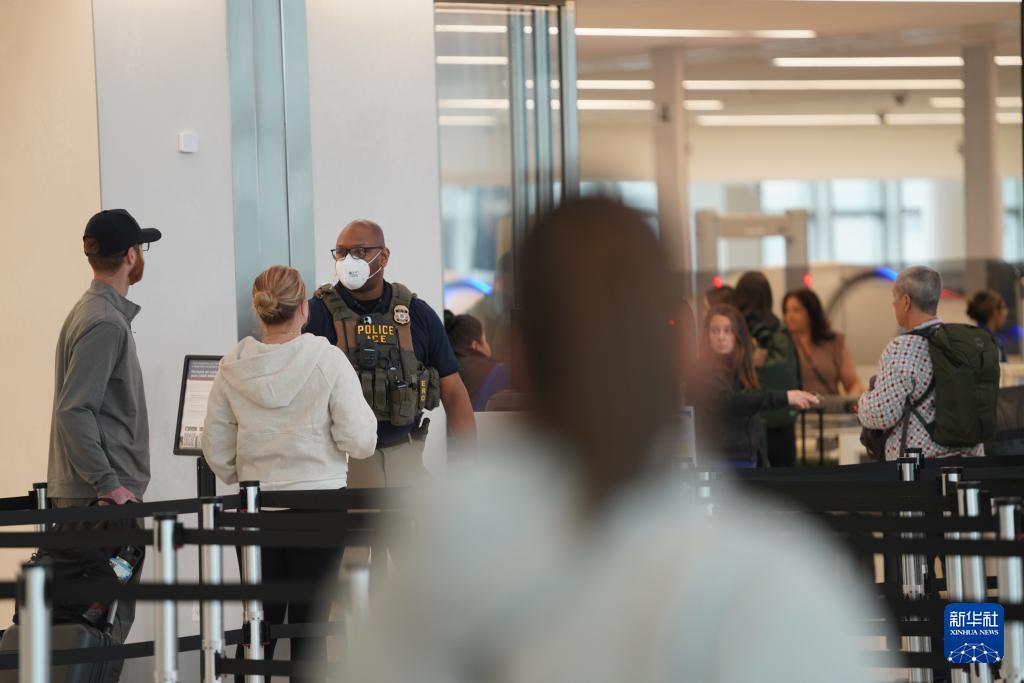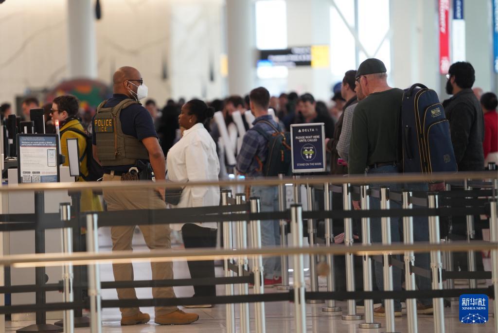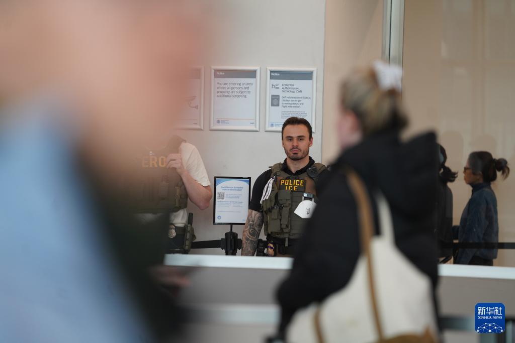 3月23日,移民与海关执法局的执法人员在美国纽约拉瓜迪亚机场的出发安检处执勤。新华社记者 张凤国 摄