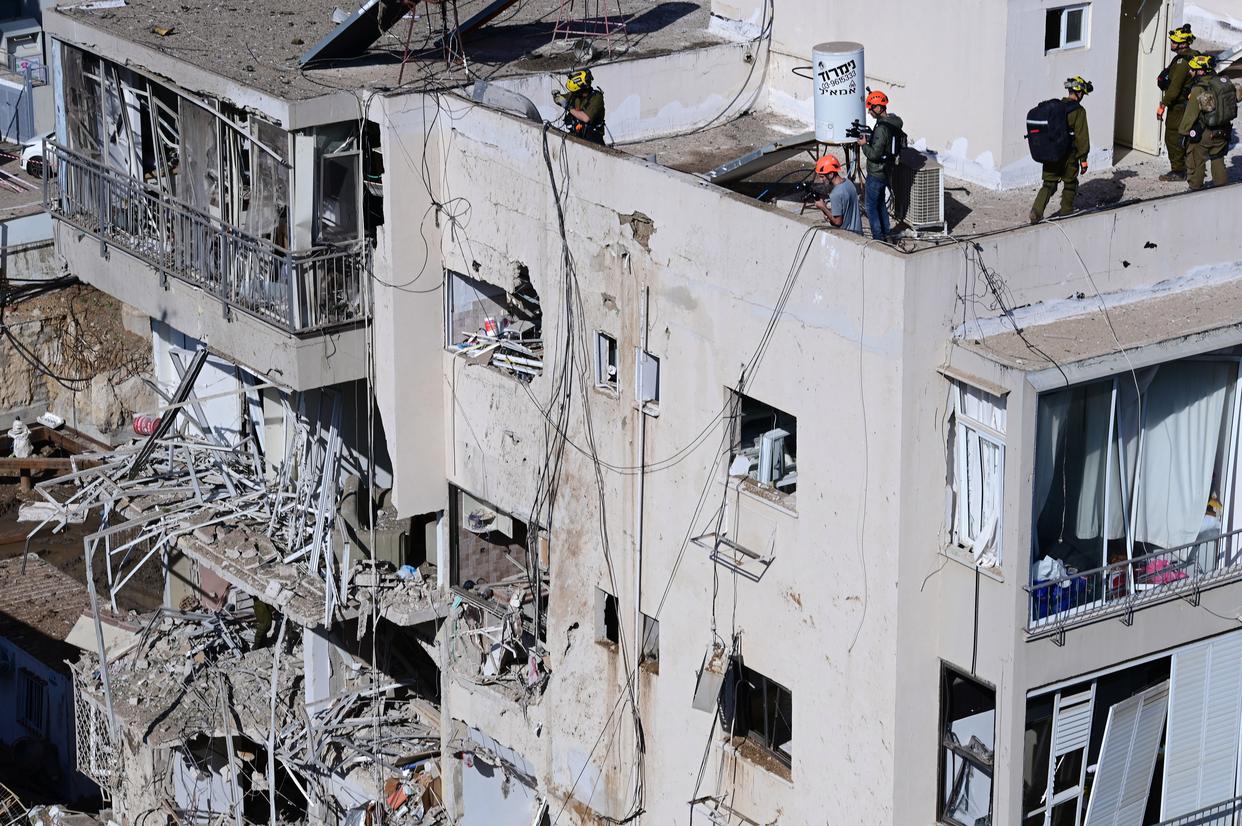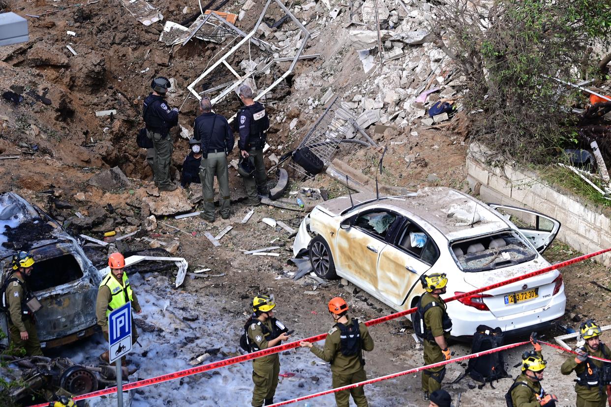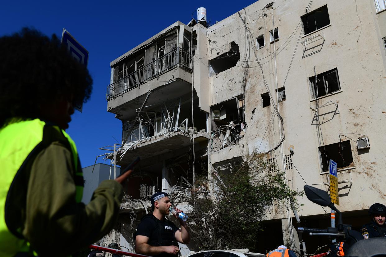 3月24日,在以色列中部城市特拉维夫,应急人员在导弹袭击现场处置。新华社发(托默·诺伊贝格摄/基尼图片社)