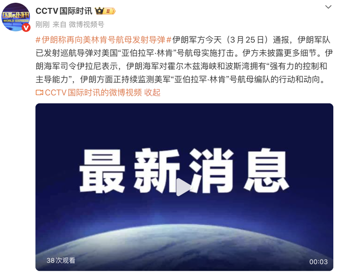 此外,伊朗军方今天(3月25日)通报,伊朗军队已发射巡航导弹对美国“亚伯拉罕·林肯”号航母实施打击。伊方未披露更多细节。伊朗海军司令伊拉尼表示,伊朗海军对霍尔木兹海峡和波斯湾拥有“强有力的控制和主导能力”,伊朗方面正持续监测美军“亚伯拉罕·林肯”号航母编队的行动和动向。