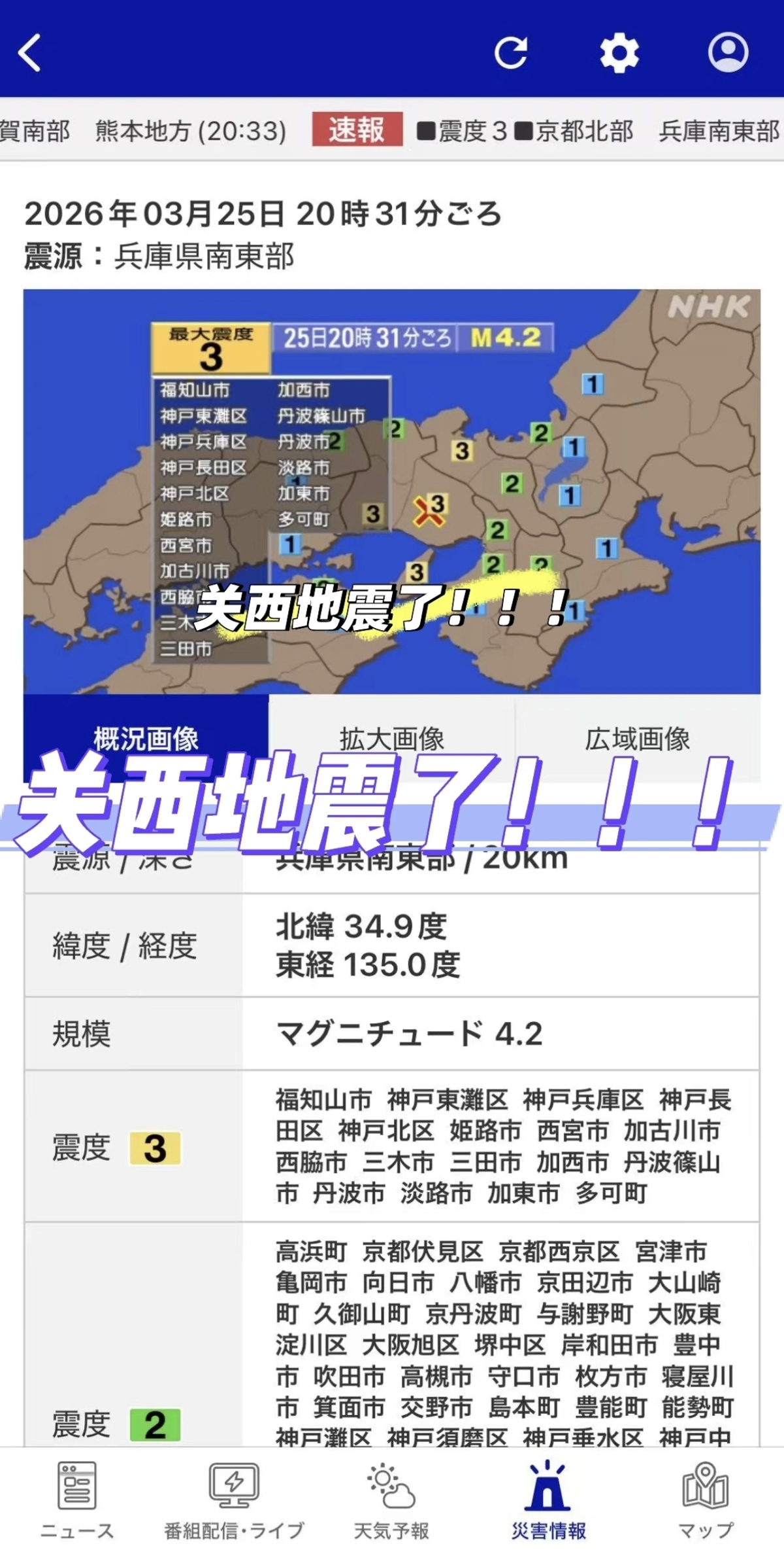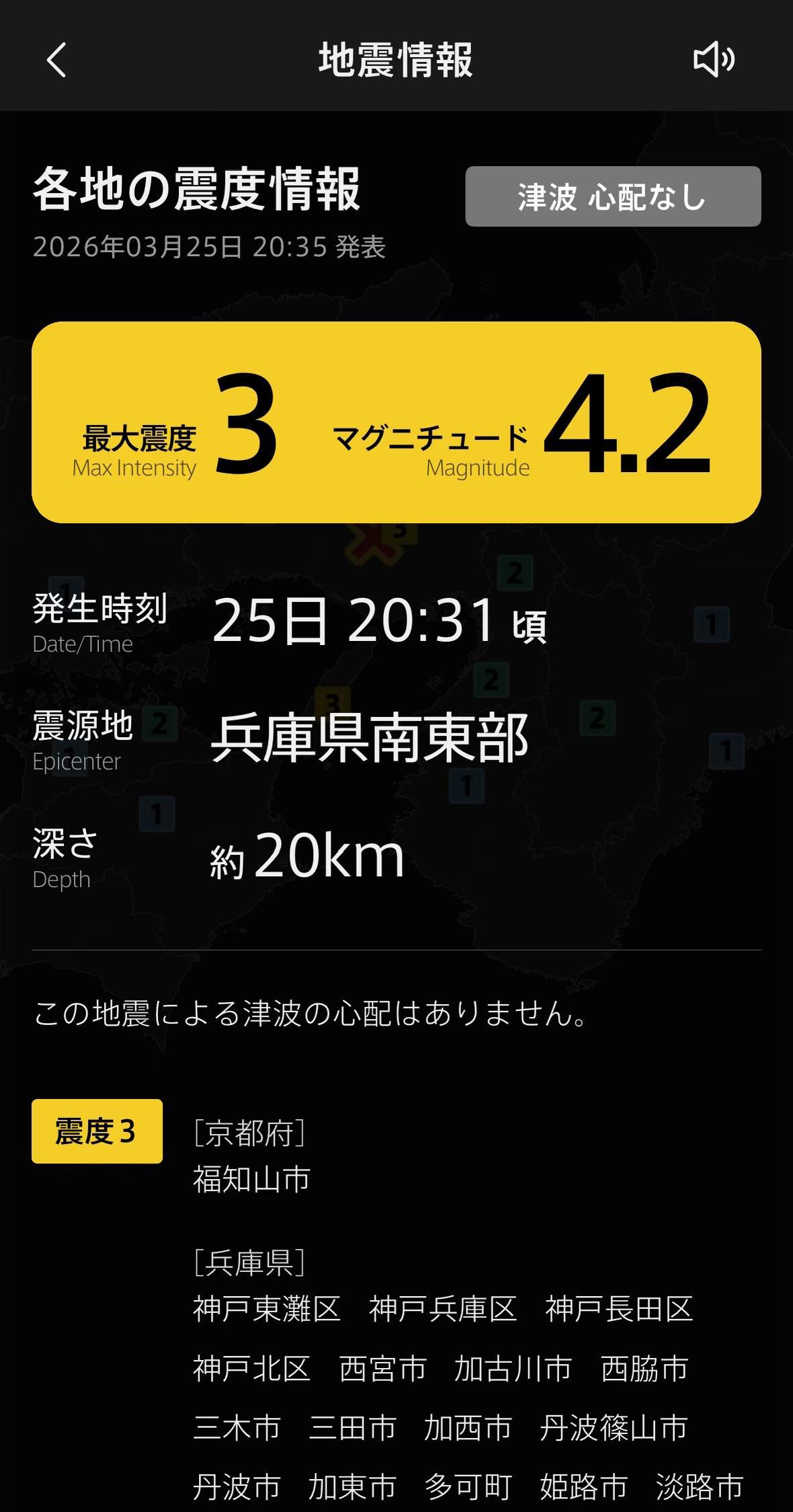 3月25日,多名在日本的网友发帖称,日本兵库县东南部发生4.2级地震,据其收到的地震情报显示,地震发生时间为25日20时31分,最大震度为3级,震源深度约为20千米。