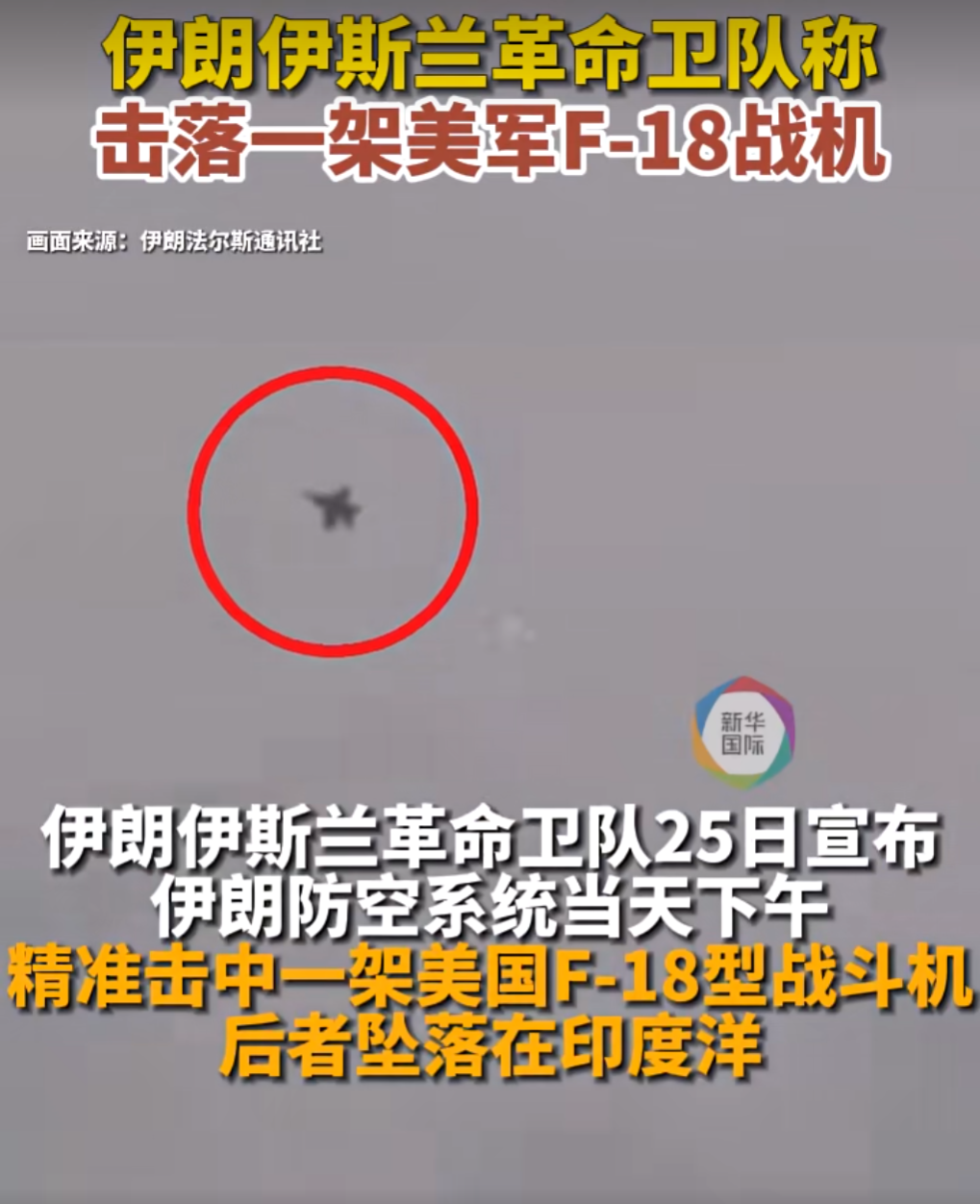 伊朗法尔斯通讯社25日公布的视频画面显示,战机被一高速飞行器击中,掉落碎片。