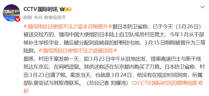 据@CCTV国际时讯,据日本防卫省称,已于今天(3月26日)被送交检方的、强闯中国大使馆的日本陆上自卫队成员村田晃大,今年1月从干部候补生学校毕业,随后被分配到宫崎县的虾野驻屯地,3月15日刚刚被晋升为三等陆尉。