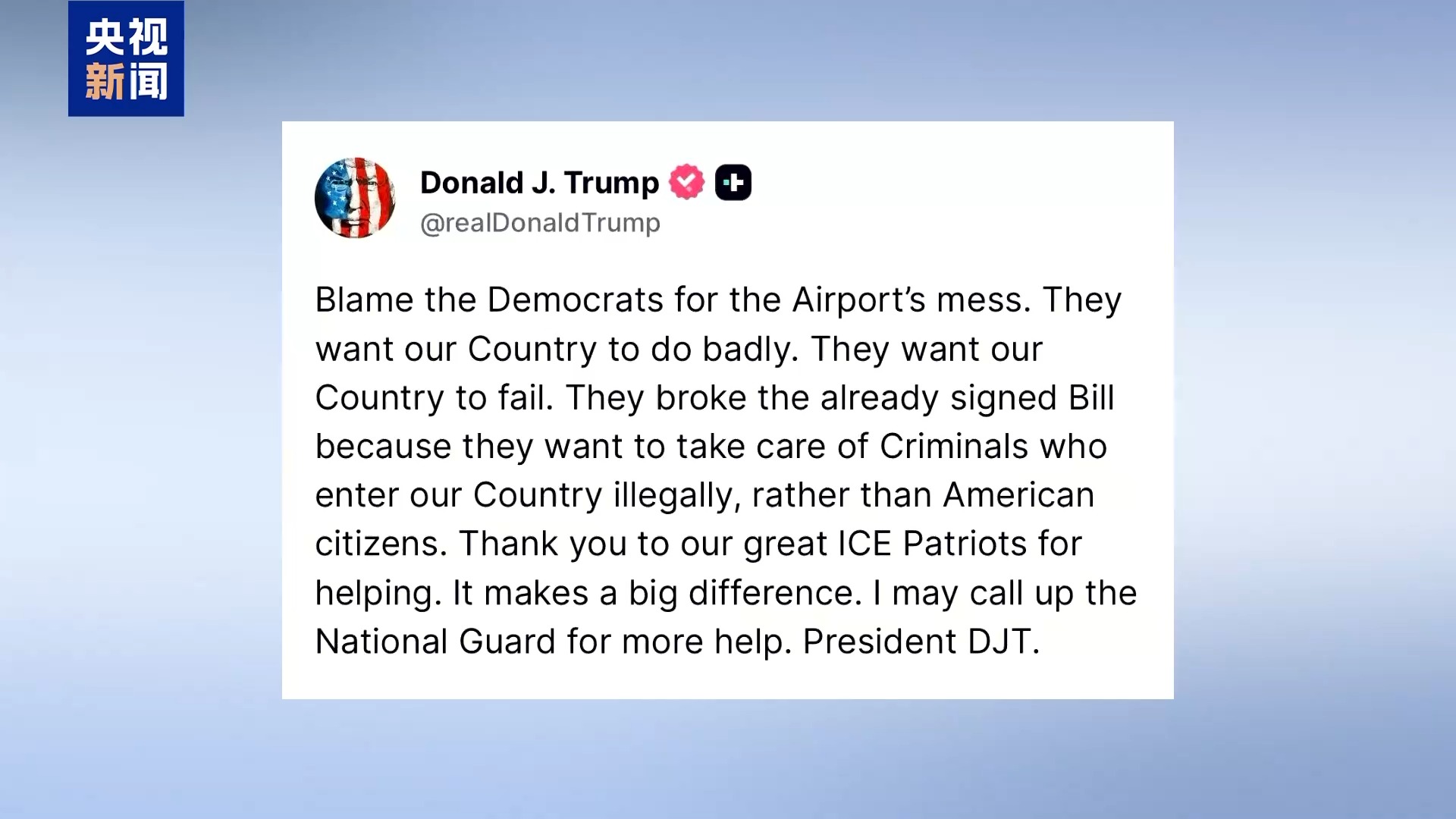 特朗普将机场混乱局面归咎于民主党人