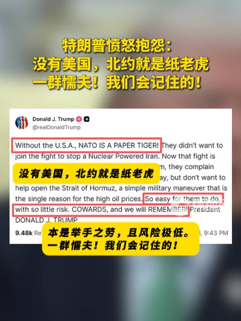 特朗普20日也曾在社交媒体上抨击北约,称北约盟友不愿加入美国和以色列对伊朗的战事,也不愿协助美国保障霍尔木兹海峡的通行,如今他们却抱怨被迫支付高油价。特朗普表示,“没有美国,北约就是纸老虎”。“一群懦夫!我们会记住的!”