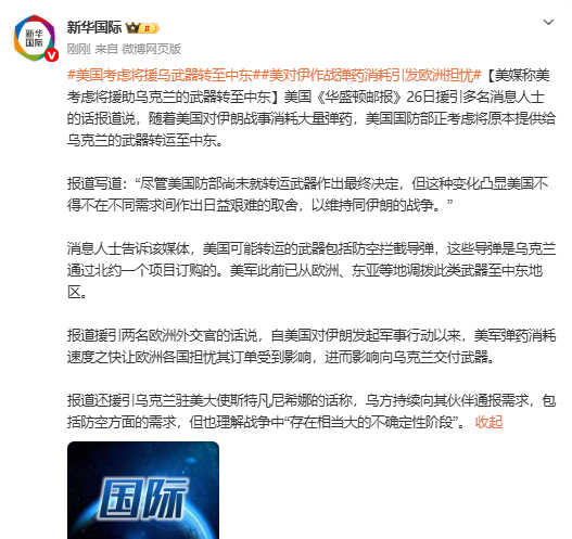 美国《华盛顿邮报》26日援引多名消息人士的话报道说,随着美国对伊朗战事消耗大量弹药,美国国防部正考虑将原本提供给乌克兰的武器转运至中东。