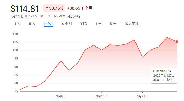 △截至3月27日(周五)收盘,2026年5月交割的布伦特原油期货价格在一个月内涨幅超过50%,达到每桶114.81美元。