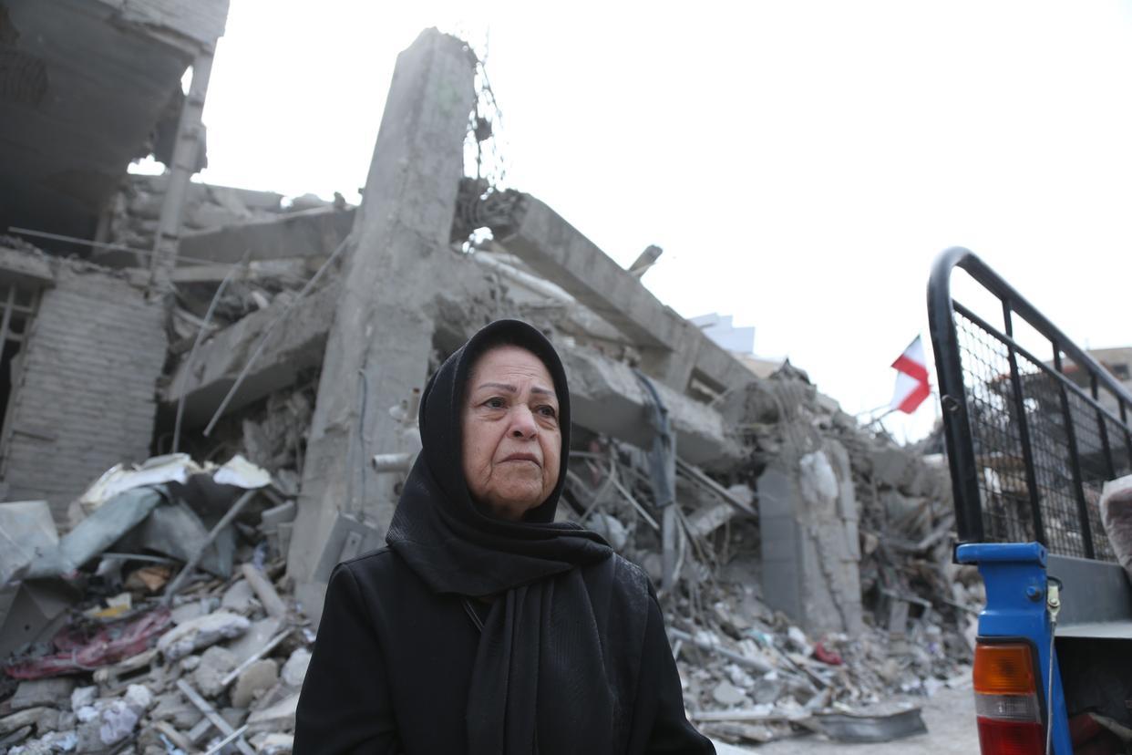3月12日,在伊朗德黑兰,市民站在建筑废墟前。新华社记者 沙达提 摄