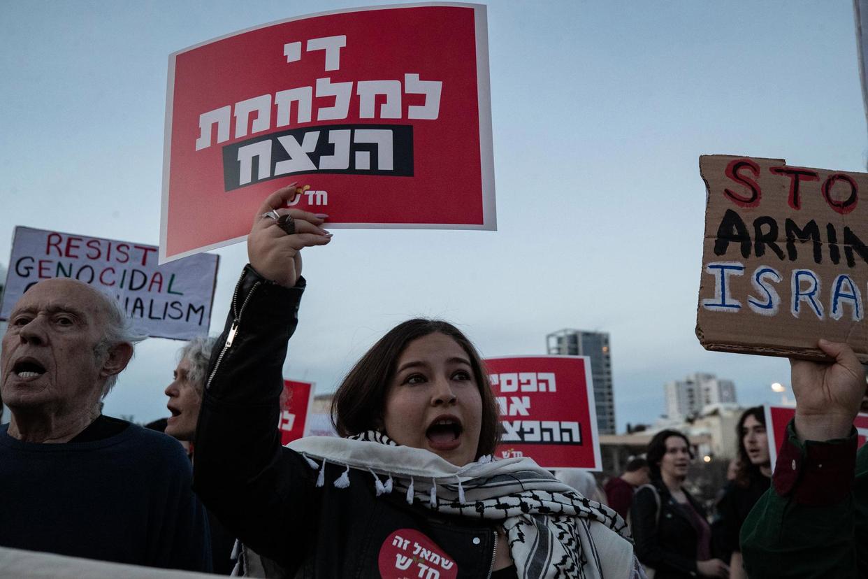 3月28日,在以色列特拉维夫一处广场,人们手持标语参加反战集会。新华社记者陈君清摄