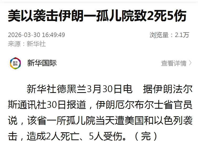据伊朗法尔斯通讯社30日报道,伊朗厄尔布尔士省官员说,该省一所孤儿院当天遭美国和以色列袭击,造成2人死亡、5人受伤。