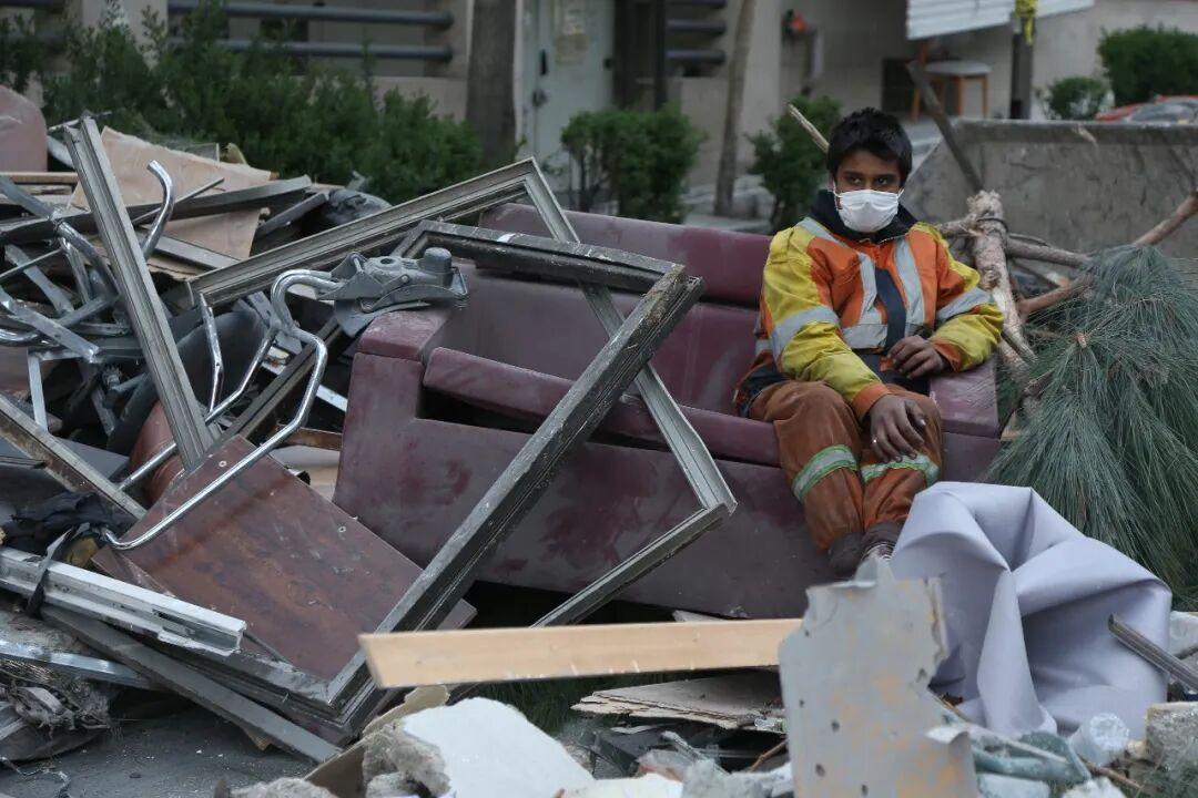 3月29日,在伊朗首都德黑兰,一名男子坐在废墟中的沙发上休息。新华社记者 沙达提 摄