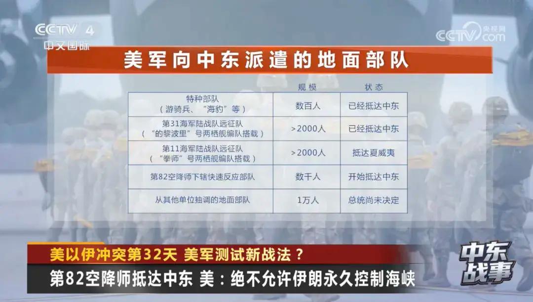 据路透社3月30日报道,美军第八十二空降师下辖快速反应部队也开始抵达中东。该部队能够在接到命令后18小时内从基地出发,执行在敌后夺取关键据点的任务。