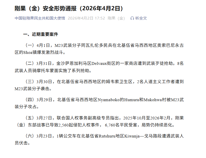 4月2日,中国驻刚果民主共和国大使馆发布《刚果(金)安全形势通报》: